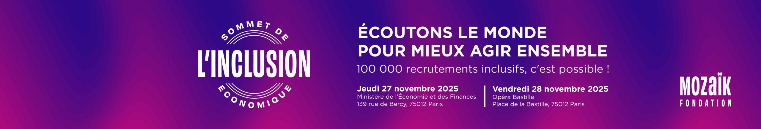Initié par la Fondation Mozaïk en 2021, le Sommet de l’inclusion économique réunit décideurs économiques, politiques, institutionnels et associatifs autour des enjeux d’inclusion par le travail quels que soit son parcours, ses origines, son profil. Objectif : débattre, échanger, connecter entreprises et talents. Avec la contribution d’experts de premier plan, ce rendez-vous se veut un espace de réflexion et d’action pour une économie plus inclusive.