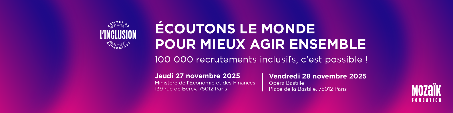Initié par la Fondation Mozaïk en 2021, le Sommet de l’inclusion économique réunit décideurs économiques, politiques, institutionnels et associatifs autour des enjeux d’inclusion par le travail quels que soit son parcours, ses origines, son profil. Objectif : débattre, échanger, connecter entreprises et talents. Avec la contribution d’experts de premier plan, ce rendez-vous se veut un espace de réflexion et d’action pour une économie plus inclusive.